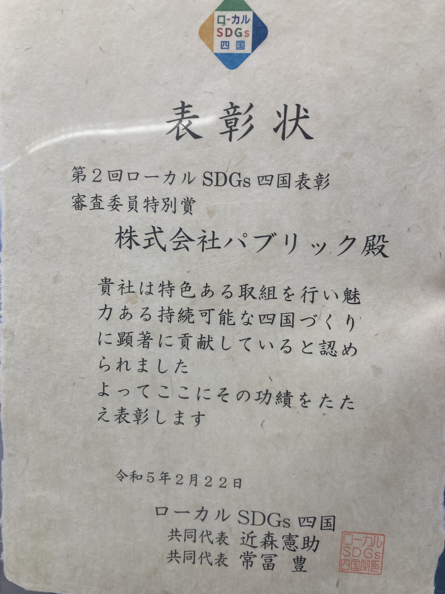 この度、弊社のSDGsを通しての取り組みが評価され、ローカルSDGs四国様より審査委員特別賞を頂きました。 (ローカルSDGs四国様URL https://ls459.net/)
