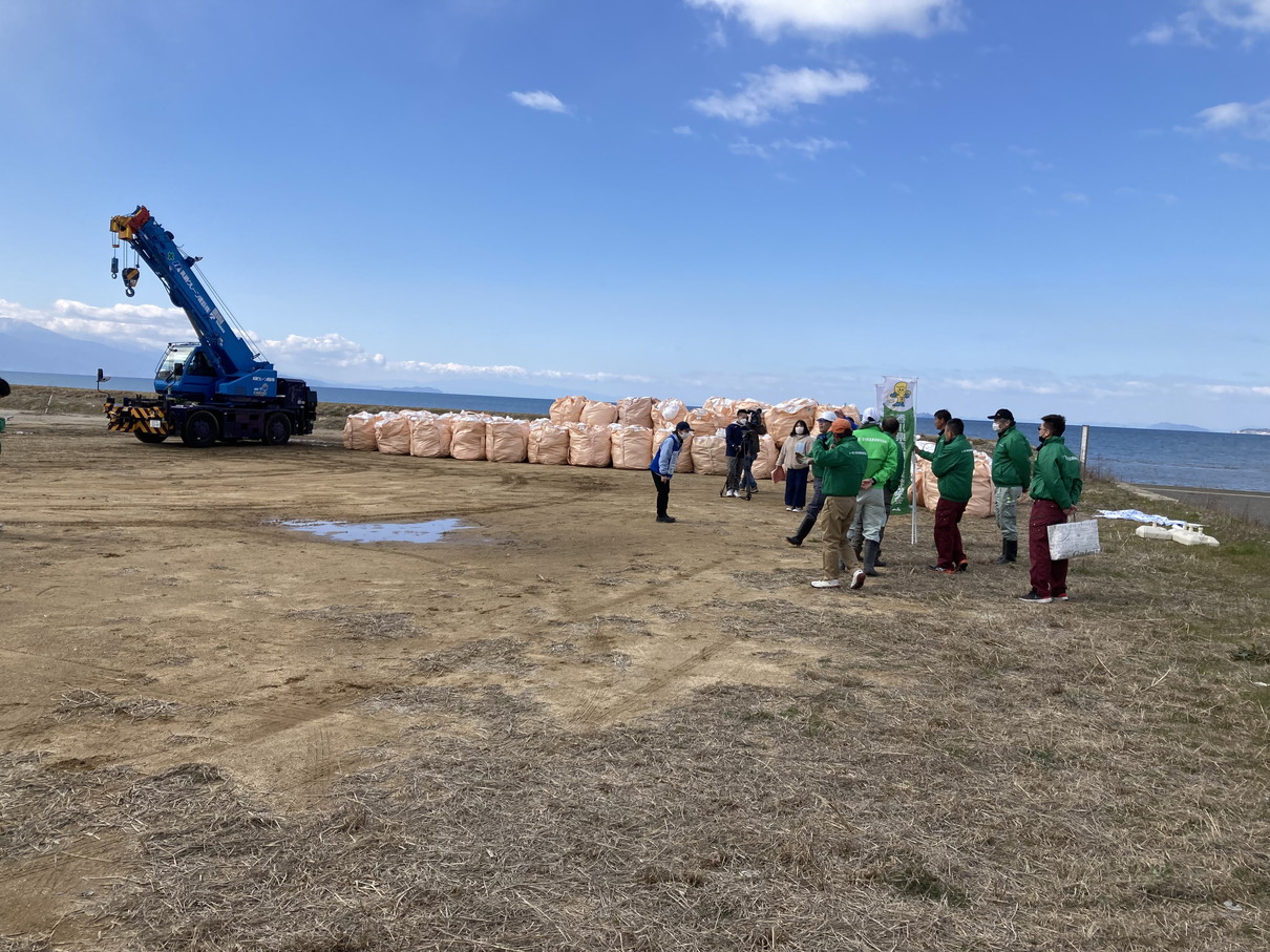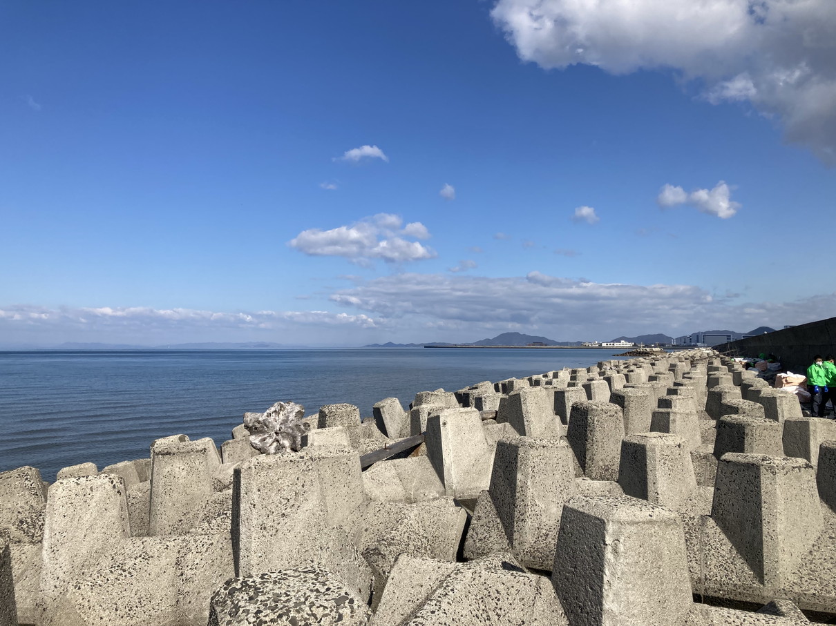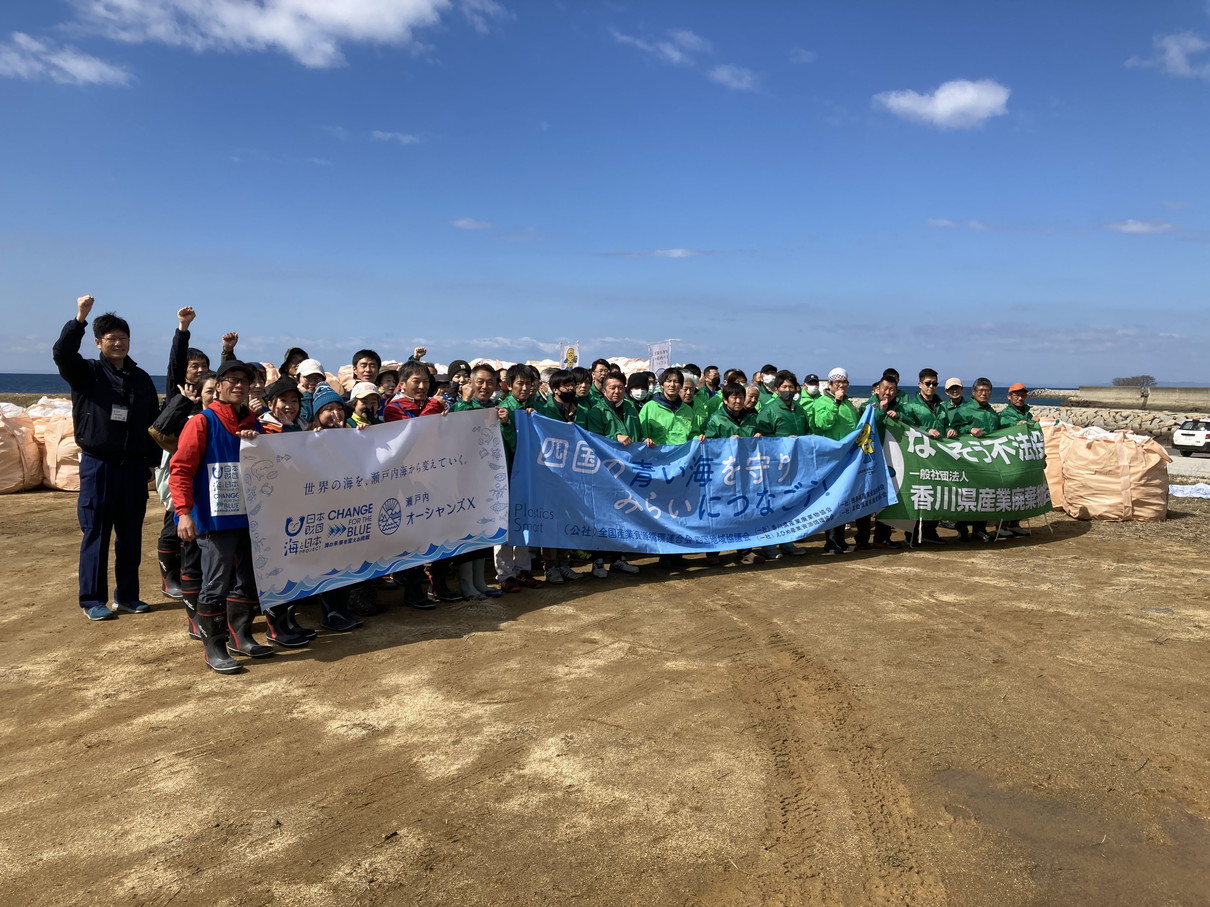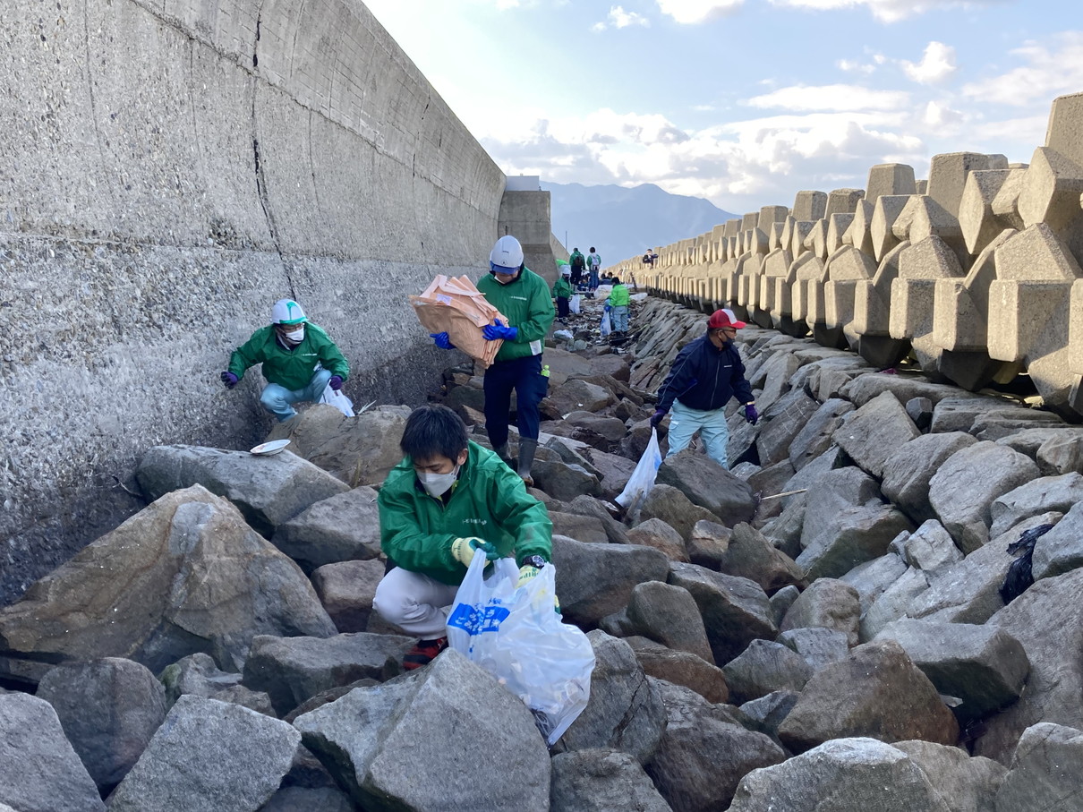 観音寺市三豊干拓海岸の岸壁に波で打ち寄せられた漂流ごみの削減を目的としたボランティア活動で、地元観音寺市の方にもご協力いただき100名を超える参加者とともに3時間にわたり清掃活動を行い、フレコンバッグ100個以上のごみを集めました。